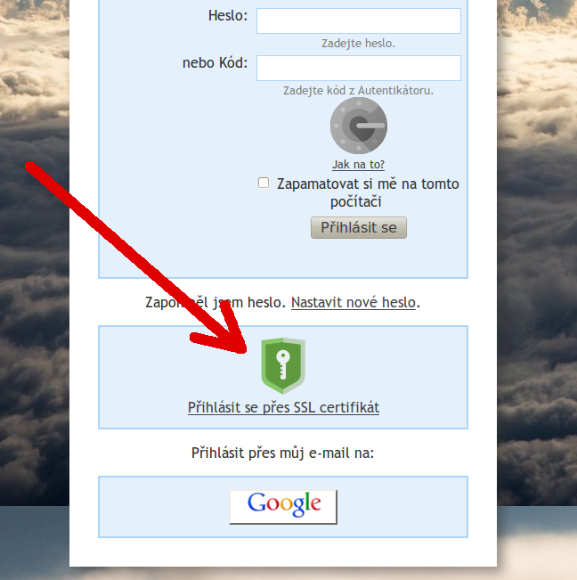 Přihlášení přes SSL certifikát je velmi jednoduché. Jakmile jej máte nainstalován v systému nebo prohlížeči, tak stačí kliknout na ikonu odkaz "Přihlásit se přes SSL certifikát" a jste přihlášeni. Již si nemusíte pamatovat přihlašovací jméno a heslo.